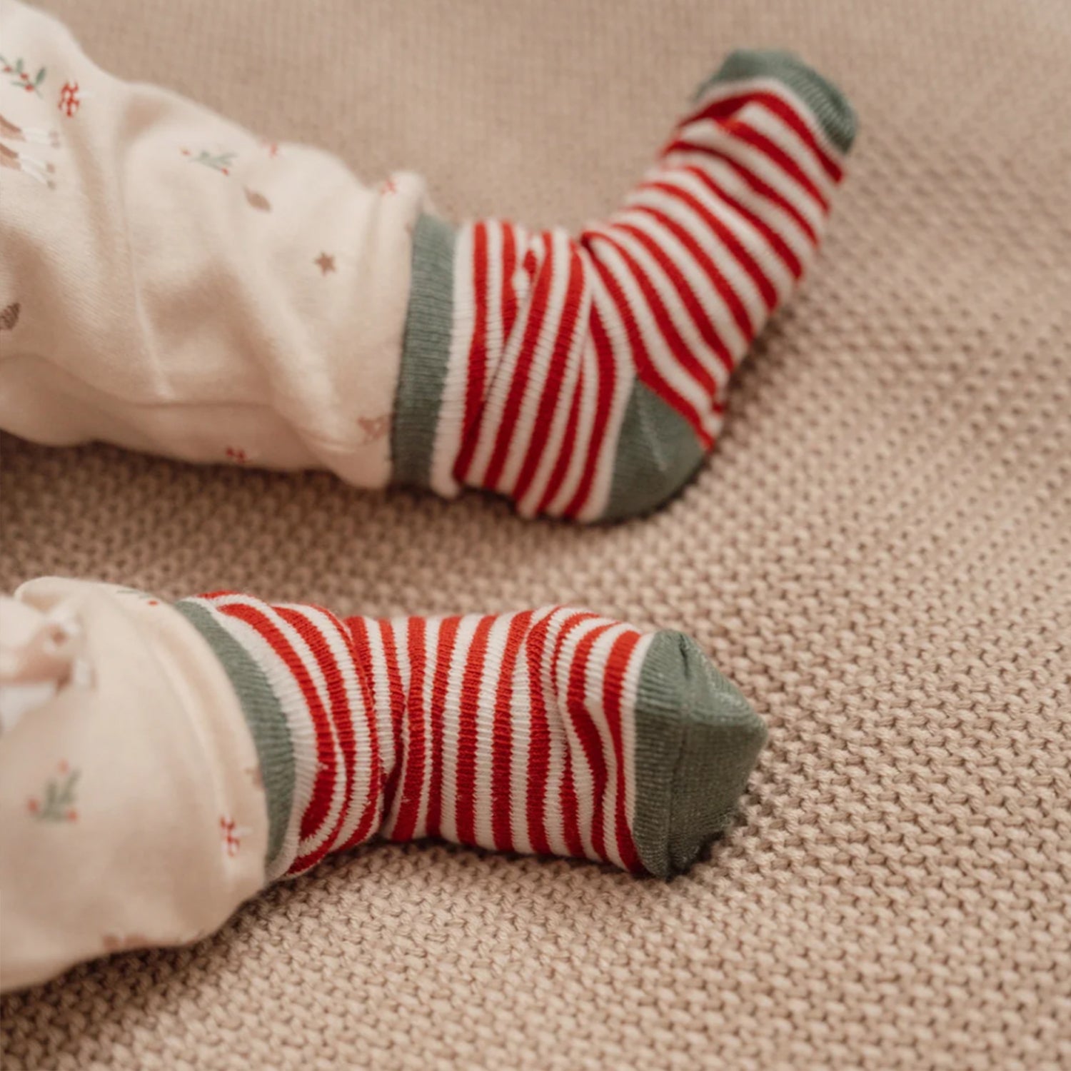 These festive little socks are designed to keep tiny toes cozy and cute throughout the holidays. Choose from three joyful styles—reindeer, holly leaves, or classic red and white stripes—to complete any Christmas outfit. Crafted from ultra-soft, chemical-free organic cotton with added stretch, these socks ensure maximum comfort. Each pair is finished with the Little Dutch logo discreetly placed on the sole.