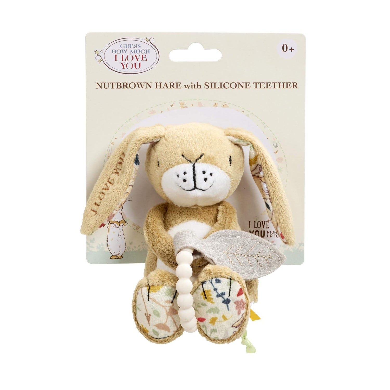 Soothe and entertain your little one with Guess How Much I Love You's Little Nutbrown Hare! This plush friend features a soft silicone teether to ease teething gums and a textured leaf tag for sensory exploration. Adorned with playful patterns on its ears and feet, this cuddly Hare is perfect for little hands to discover and love.