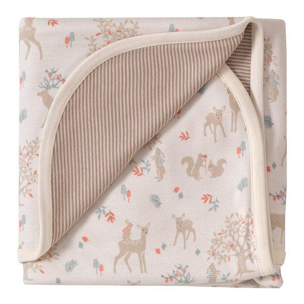 A soft reversible organic blanket with gorgeous Woodland Deer print on one side and stripes on the reverse - in double thickness jersey.