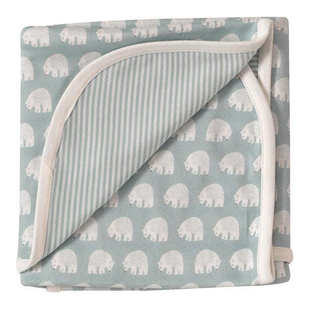 A soft reversible organic blanket with Bear print on one side and stripes on the reverse - in double thickness jersey. Perfect for Baby Boy or Girl.