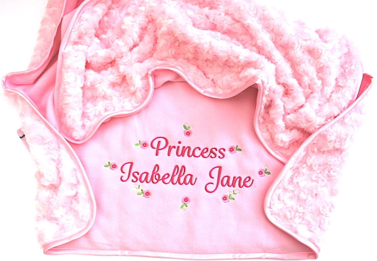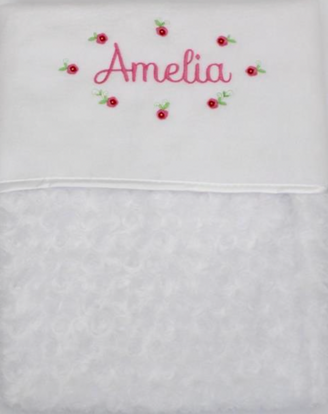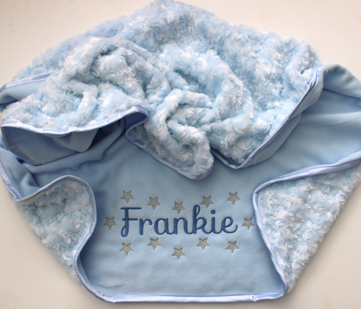 Personalised blankets will be uniquely embroidered with Baby's Name (and date of birth if requested) in large lettering surrounded with small roses, or stars, in any colour you wish! Placed at the top of the blanket on the folded back edge on the fleece side for better definition of the embroidery.
