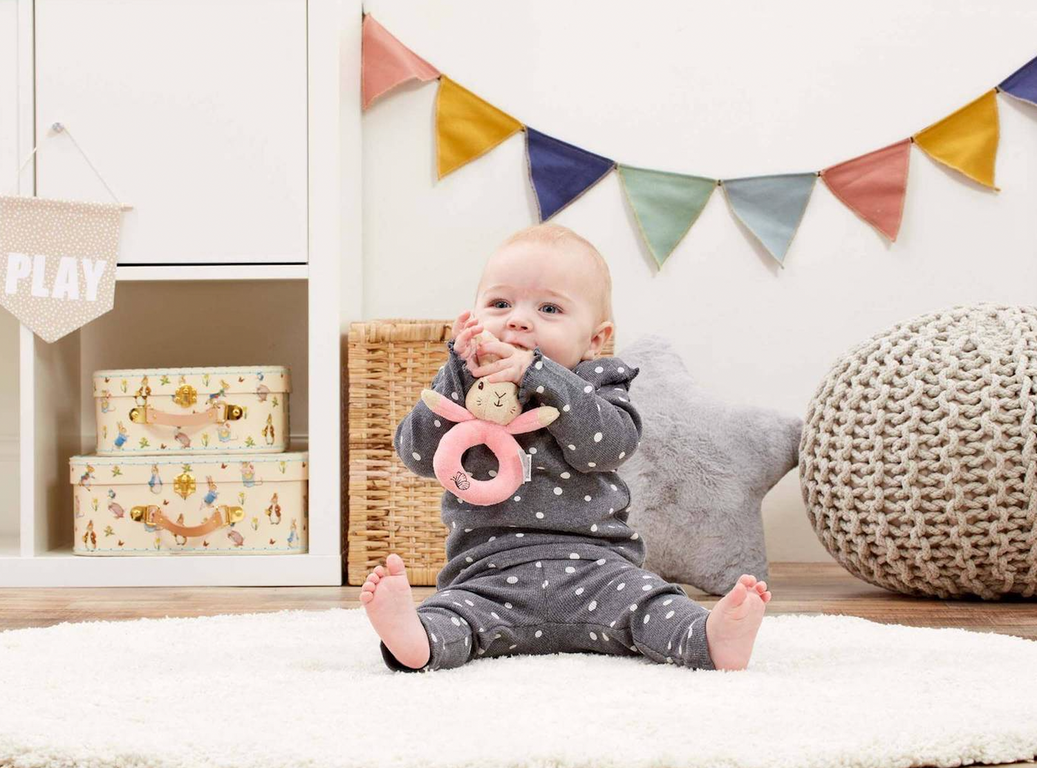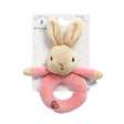 A super soft Plush Ring Rattle featuring Peter Rabbit's friend Flopsy Bunny from the classic Beatrix Potter tales.