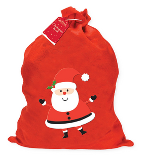 A red and white soft felt Christmas sack, decorated on the front with a Merry Santa design and drawstring tie top.