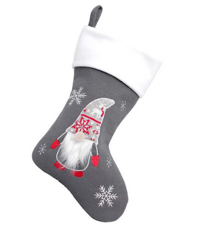 An awesome fully lined grey Christmas stocking, decorated on the front with embroidered snowflakes and an appliquéd Nordic Gnome with a bobble nose wearing a knitted red and white hat, red boots and mittens.