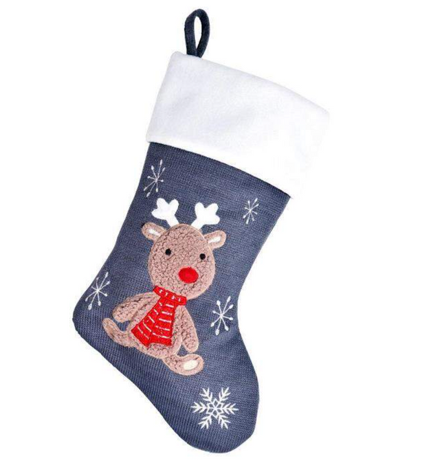 A super cute Woodland Reindeer deluxe knitted grey and white appliquéd Christmas Stocking.