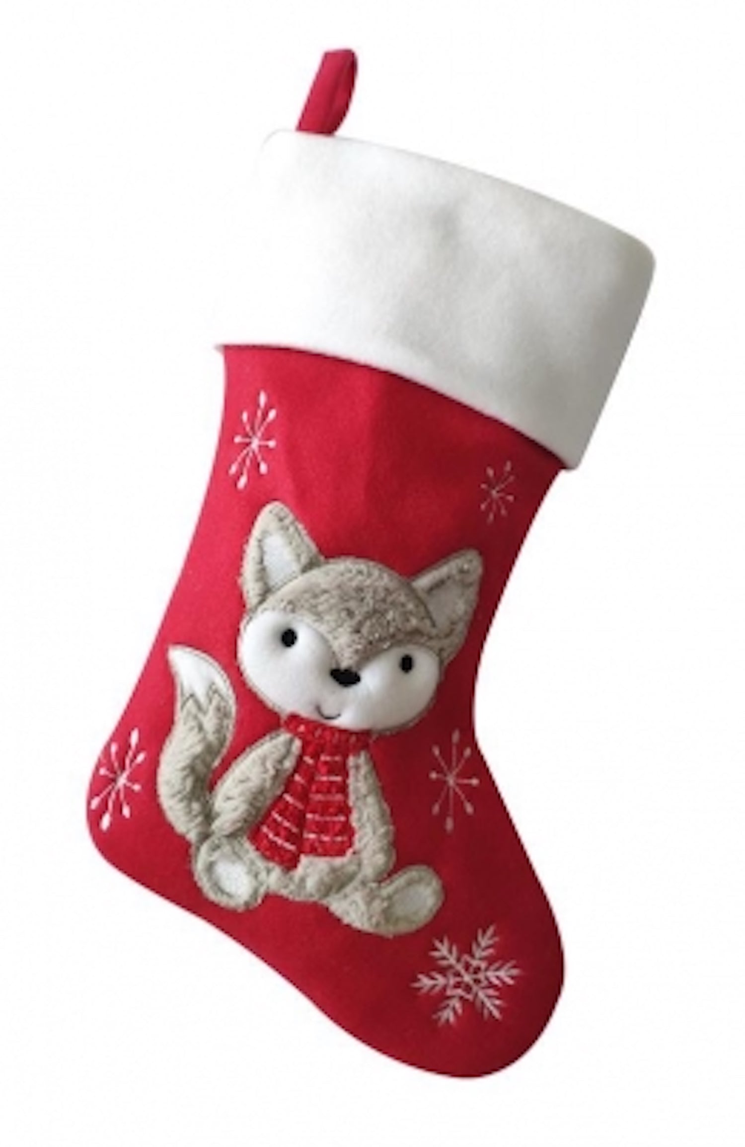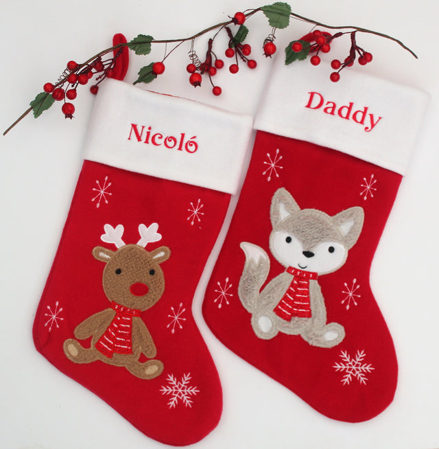 A super cute Woodland Fox deluxe red and white appliquéd Christmas Stocking.