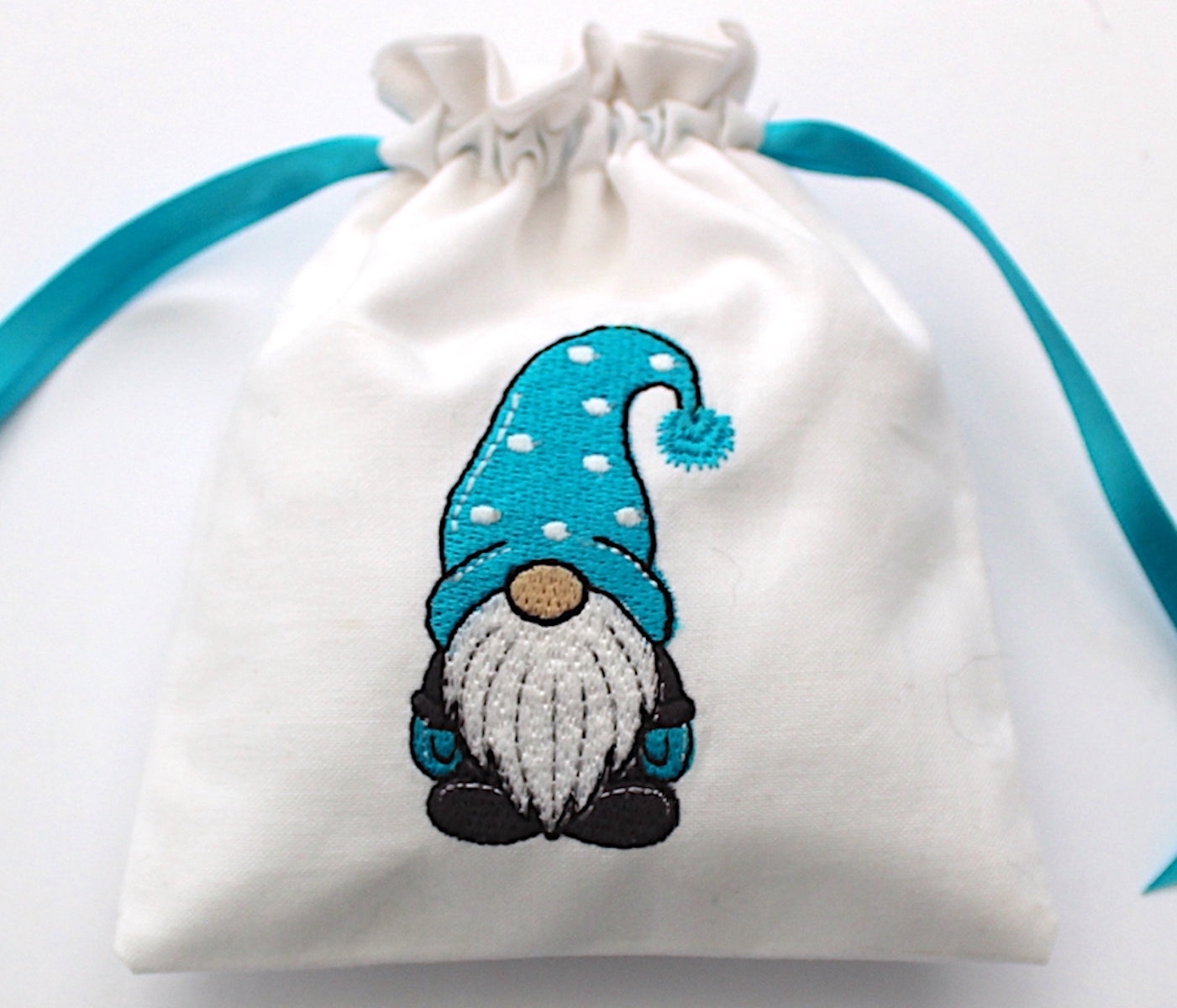 A super cute turquoise Gnome drawstring bag - perfect for a little Christmas Gift and can be made extra special by adding an embroidered name.