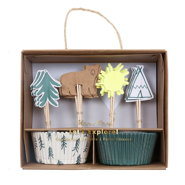 A cupcake kit for a wilderness party including cupcake cases with forest patterns and 4 styles of topper with forest camping motifs.