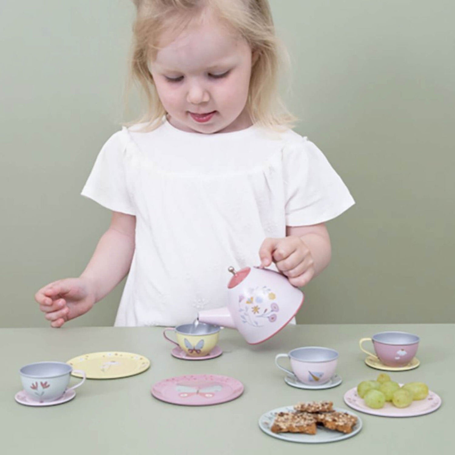 This beautifully decorated Tea Set with Flowers & Butterflies from Little Dutch is part of the charming Flowers & Butterflies range, perfect for inspiring imaginative play and creative storytelling. The delightful floral and butterfly design brings a touch of springtime magic to every tea party, while the tin construction ensures durability for years of pretend play adventures.