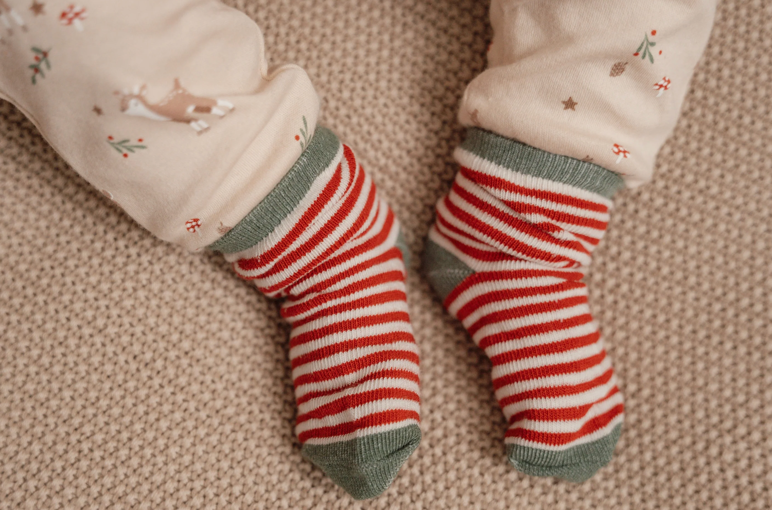These cute little socks will make tiny toes feel festive. There are three styles to choose from to complete your Christmas outfit. With reindeers, holly leaves or white and red stripes. Made from soft fabric with added stretch for comfort. Each pair is cut from chemical-free organic cotton and comes finished with a Little Dutch logo at the sole.