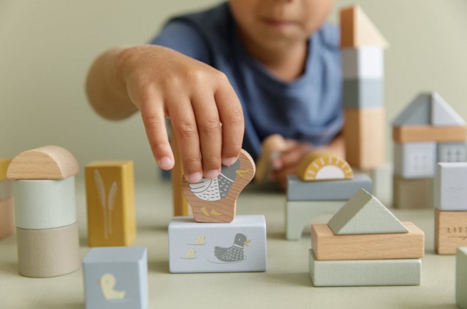 The bucket contains no less than 50 wooden blocks in in various shapes and sizes, decorated with Little Goose and his friends from the countryside. Stack the blocks to build fun shapes or towers. The blocks guarantee a lot of building fun and can be stored effortlessly in the bucket!