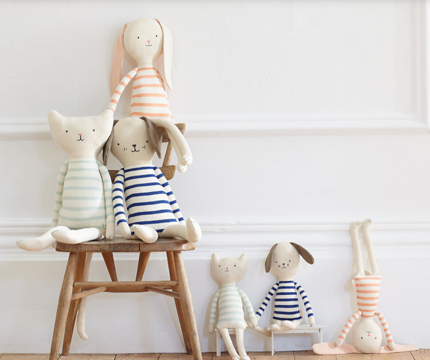 Chester the Cat is the perfect companion for little ones who would love a cuddly feline friend. Beautifully made from knitted organic cotton with adorable stitched features. Wearing a mint striped jumper. She has the sweetest face with its pink nose and embroidered whiskers, perky ears and the longest tail!