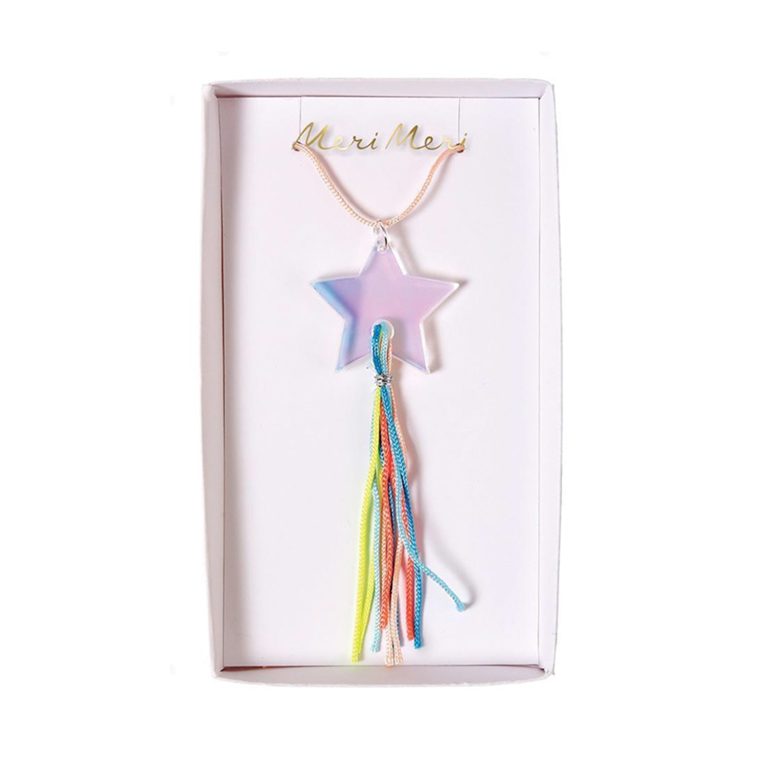 A very pretty children's necklace, showcases a shooting star pendant crafted with iridescent acrylic and a rainbow thread tail hanging on a pink cord.