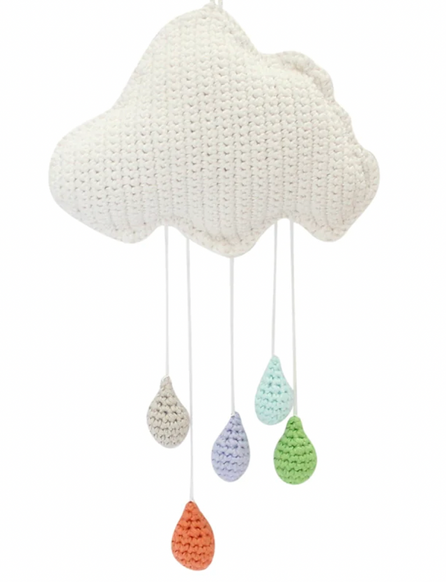 Beautiful hand crochet cloud with multi-coloured rain drops - perfect mobile for decorating a nursery or children's room.
