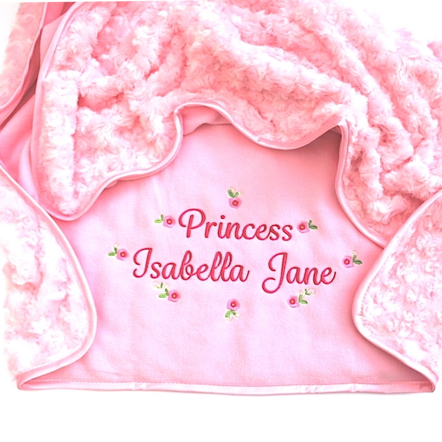 Personalised blankets will be uniquely embroidered with Baby's Name (and date of birth if requested) in large lettering surrounded with small roses, or stars, in any colour you wish! Placed at the top of the blanket on the folded back edge on the fleece side for better definition of the embroidery.