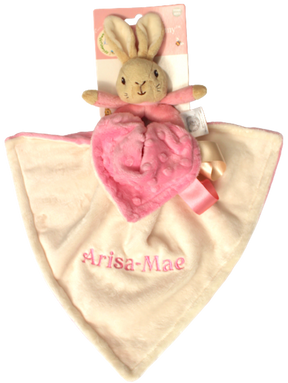 Personalised Soft Comforter and Flopsy Bunny or Peter Rabbit Ring Rattle.
