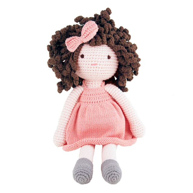 Eliza is a really cute doll wearing grey boots and a lovely coral dress with matching bow in her curly brown hair.  Easy size for little ones to carry around and take on all their adventures.