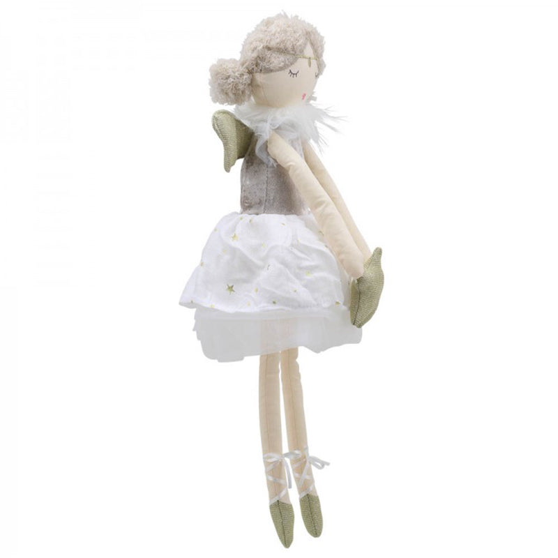 Straight from the heavens, Grace with her curly hair and and gold headband makes the perfect bedtime companion. Her angelic body is soft and cuddly with gold sparkly wings and shoes. She wears a gauze white skirt with golden stars.