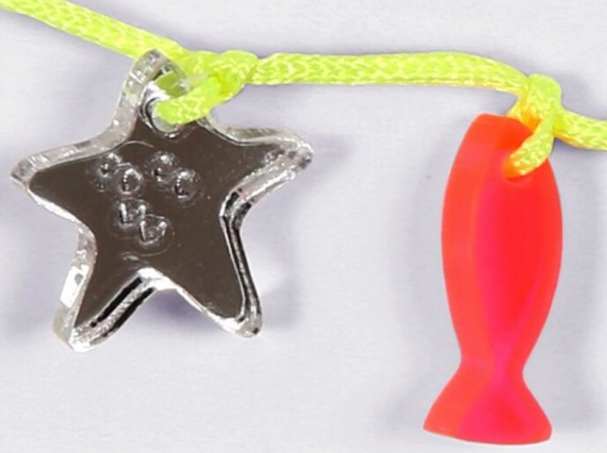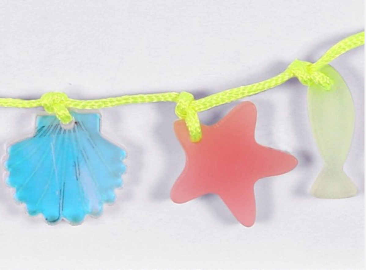 A very pretty charm bracelet with a colourful marine theme.  This bracelet features an array of undersea critters crafted in acrylic and suspended from a neon yellow cord with silver jump rings, clasp and plaque.