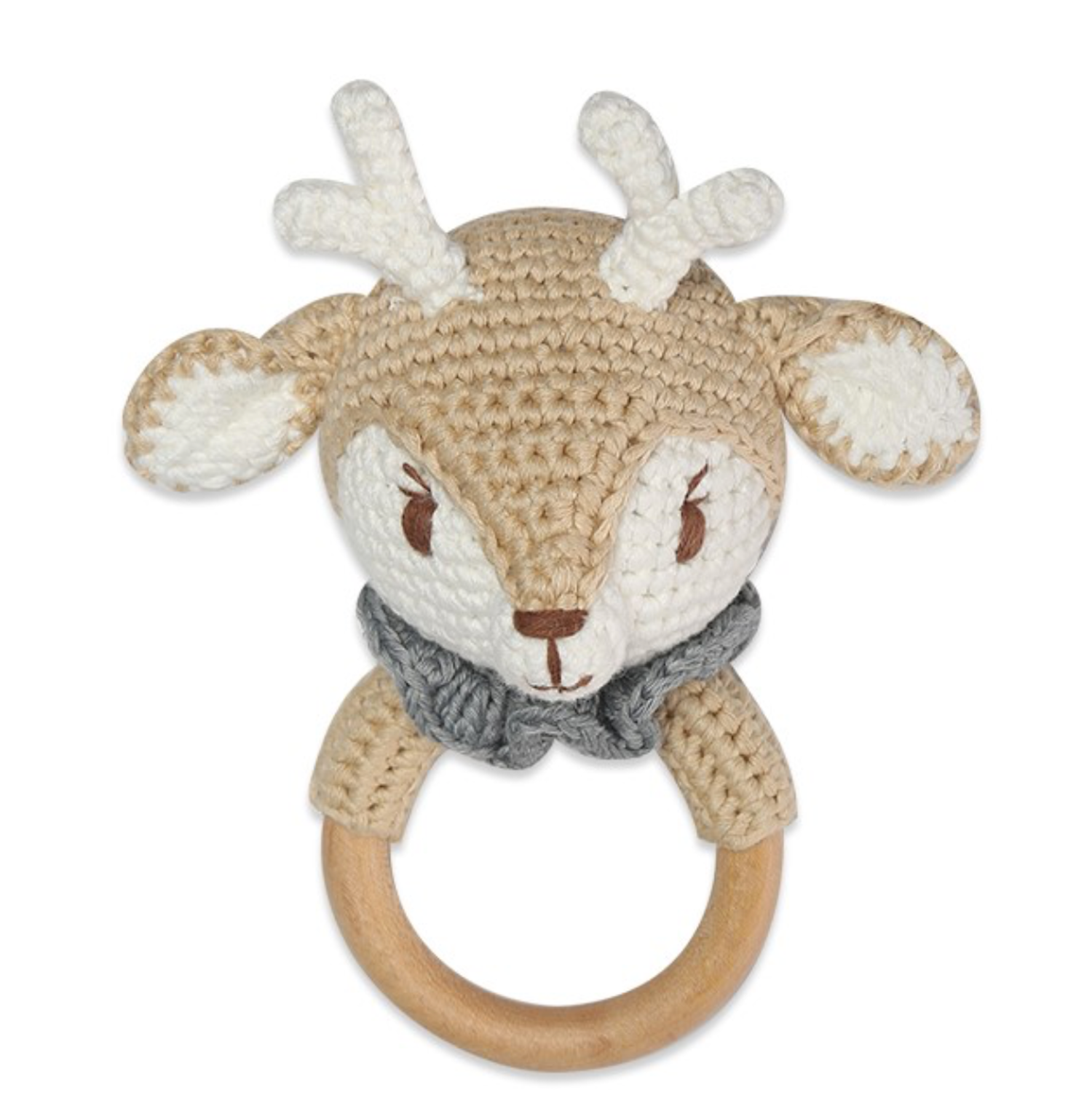 A wonderful hand crocheted Reindeer Ring Rattle / Wooden Teether.