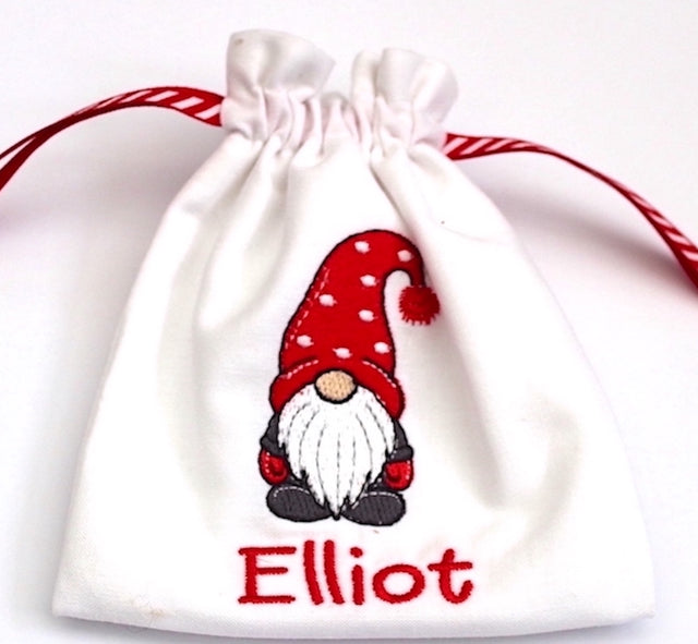 A super cute red Gnome drawstring bag - perfect for a little Christmas Gift and can be made extra special by adding an embroidered name.