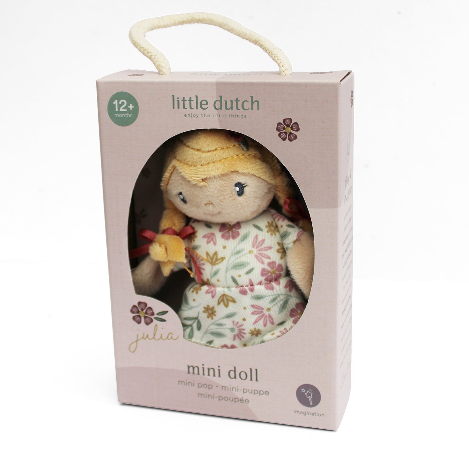 This adorable mini cuddle doll from Little Dutch is a sweet little friend with cute braids and a flower in her hair. Julia wears a cheerful floral dress and soft boots with a pompom, ready to become your child's treasured companion.